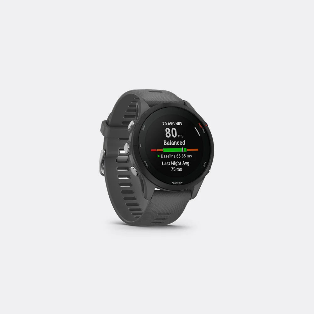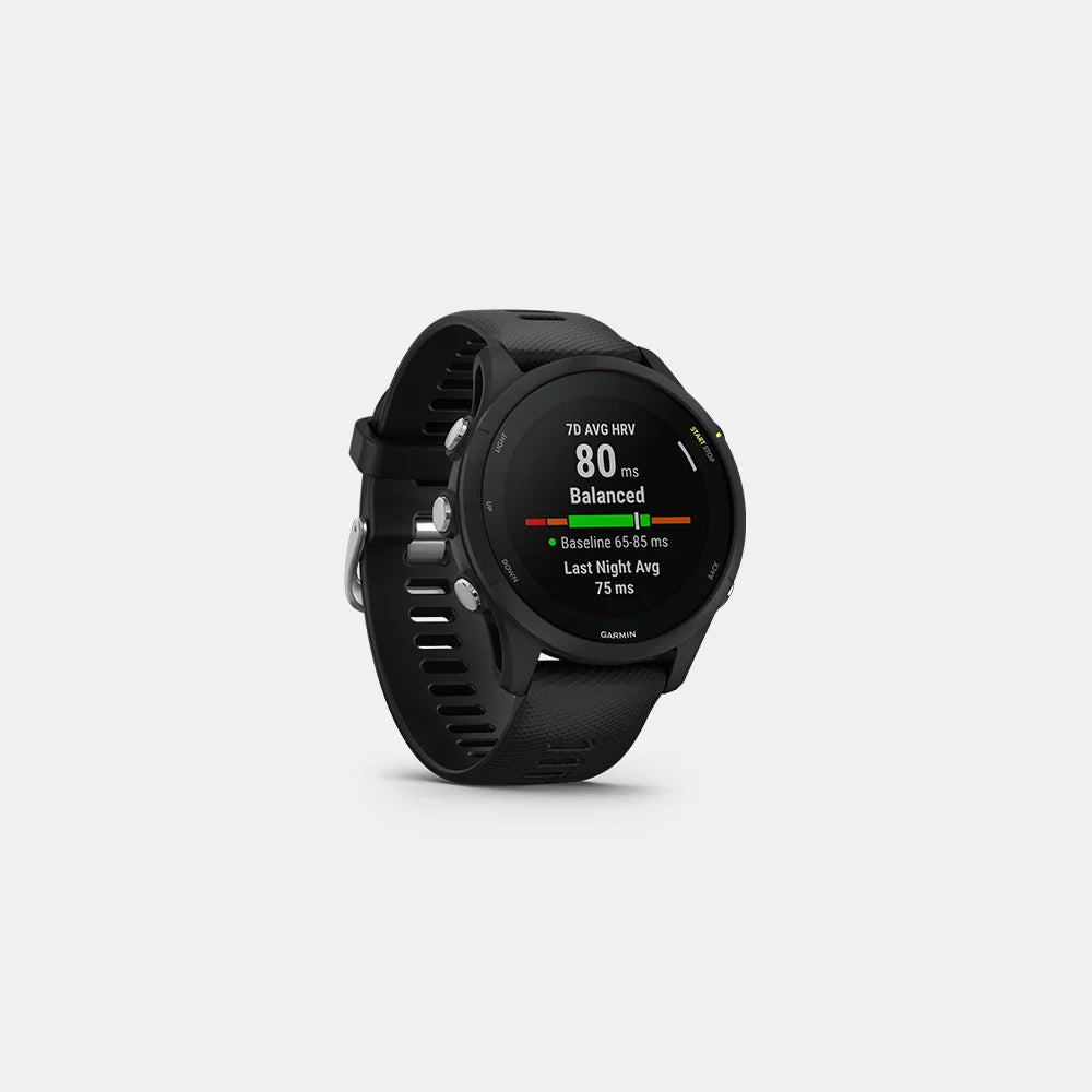 The Garmin Forerunner 255 is a lightweight, feature-packed GPS sports watch built for runners and triathletes. It offers accurate multi-band GPS tracking, up to 14 days of battery life in smartwatch mode, and advanced training tools like daily suggested workouts, race predictions, and HRV status. It tracks heart rate, sleep, stress, and includes Garmin Pay™ and smart notifications. The Forerunner 255 Music version adds onboard storage for up to 500 songs, allowing phone-free listening via Bluetooth headphones. It's a solid choice for athletes who want pro-level features without the price.